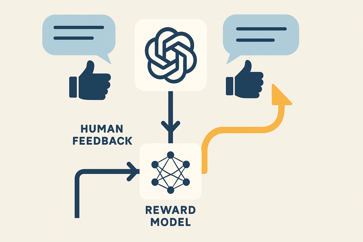 这时,强化学习就派上了大用场,特别是基于人类反馈的强化学习 (RLHF)。它的巧妙之处在于,利用人类对模型不同输出的偏好排序,训练出一个奖励模型 (Reward Model)。这个奖励模型就像一个“品味裁判”,能评估 AI 生成内容的质量,输出一个奖励分数。然后,以大模型为智能体,对话过程为环境,奖励模型的分数为奖励信号,通过 RL 算法(如 PPO)不断优化模型的策略,使其更倾向于生成人类喜欢(即奖励分数高)的回答。这样,模型就学会了“投其所好”,行为更加符合人类的价值观和期望。